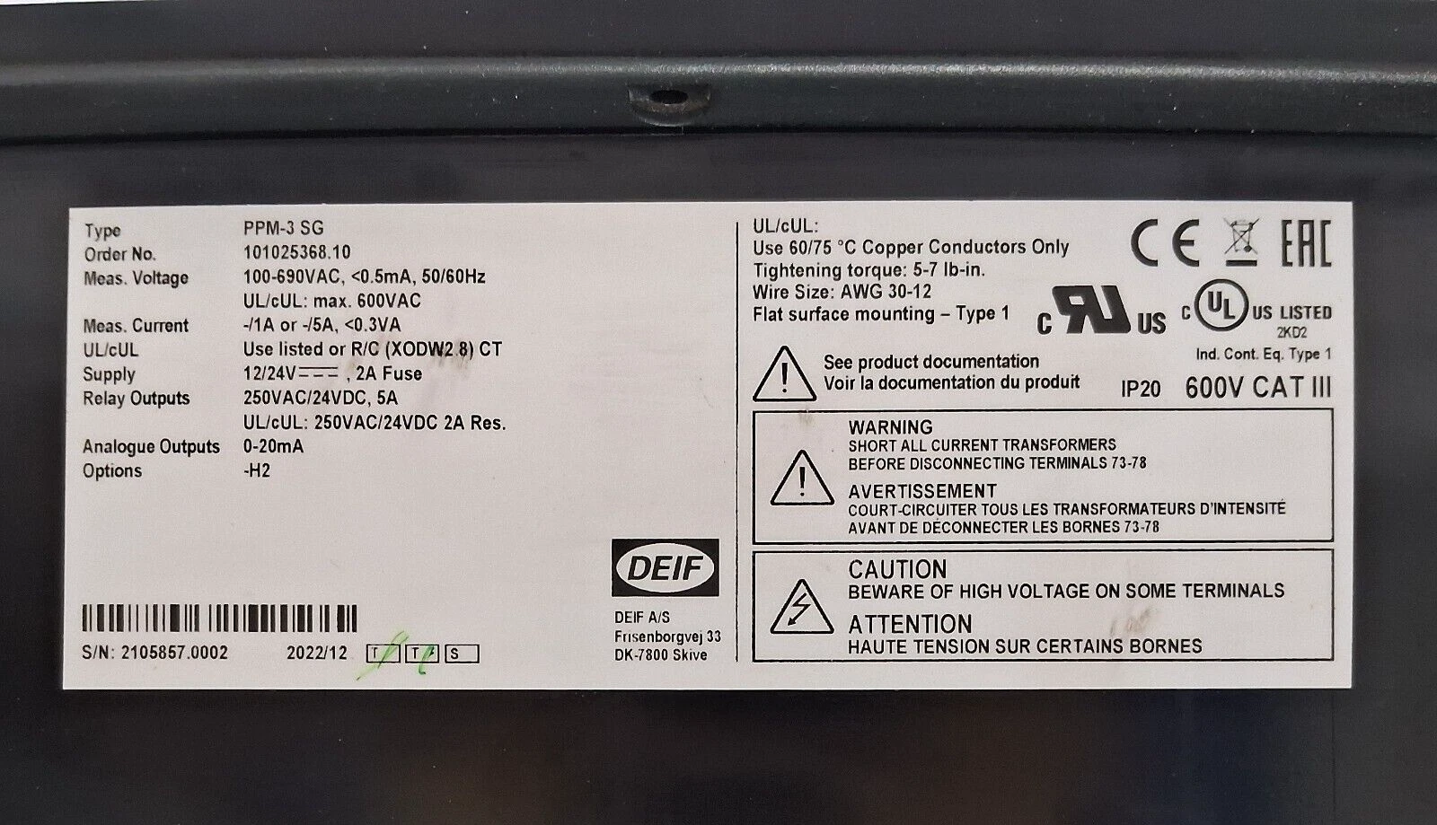 UL/CUL MAX.600VAC